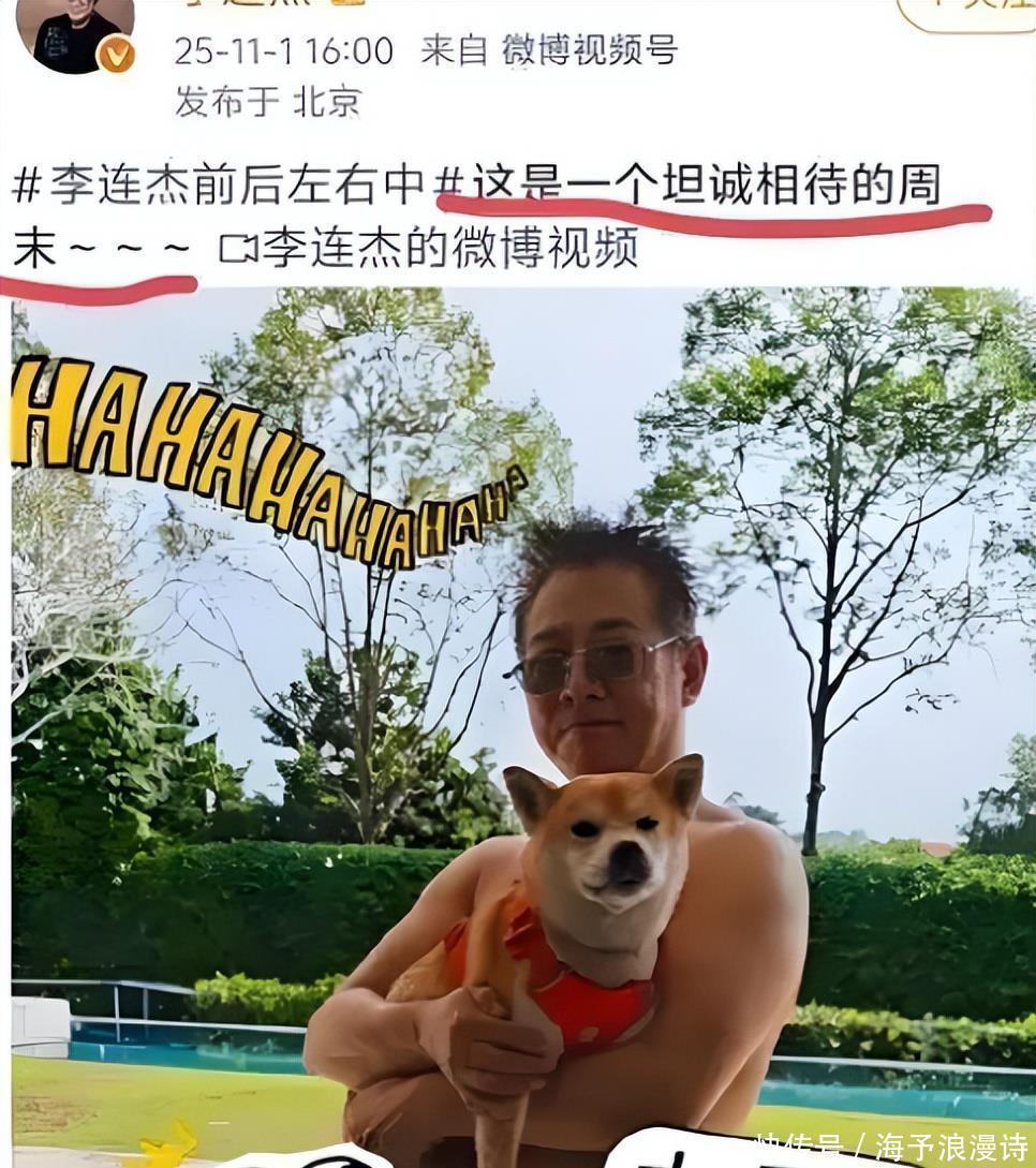 11月1日,李连杰决定在社交平台上和大家“坦诚相见”。他脱光了上衣光着膀子在自家豪宅里游泳,在院子里跑步。他还和家里的宠物狗“多多”玩耍,非常开心。